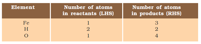 Step IV: Fe and H atoms are still not balanced. Pick any of these elements to proceed further. Let us balance hydrogen atoms in the partly balanced equation. To equalise the number of H atoms, make the number of molecules of hydrogen as four on the RHS.